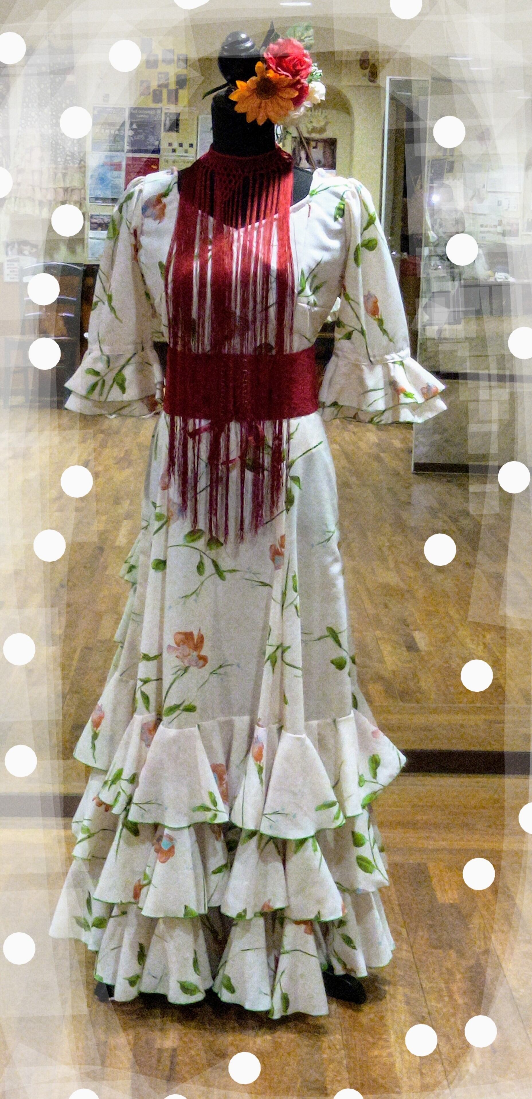 アイボリーベージュ地模様生地に花柄上下衣装に!(ペチコートを入れると5点になります)